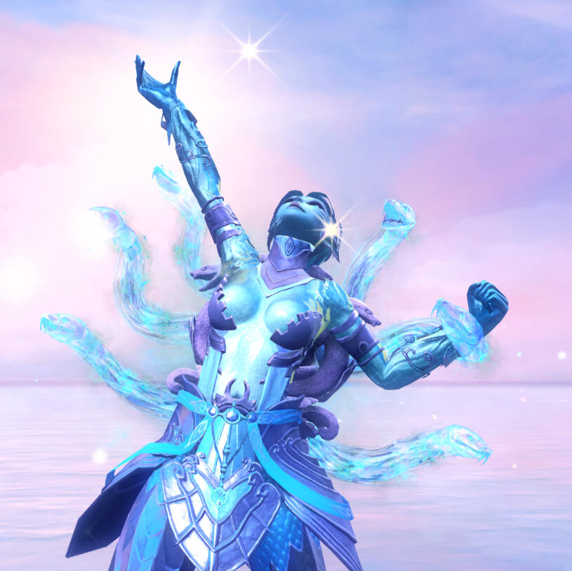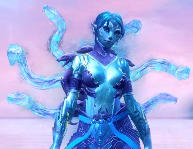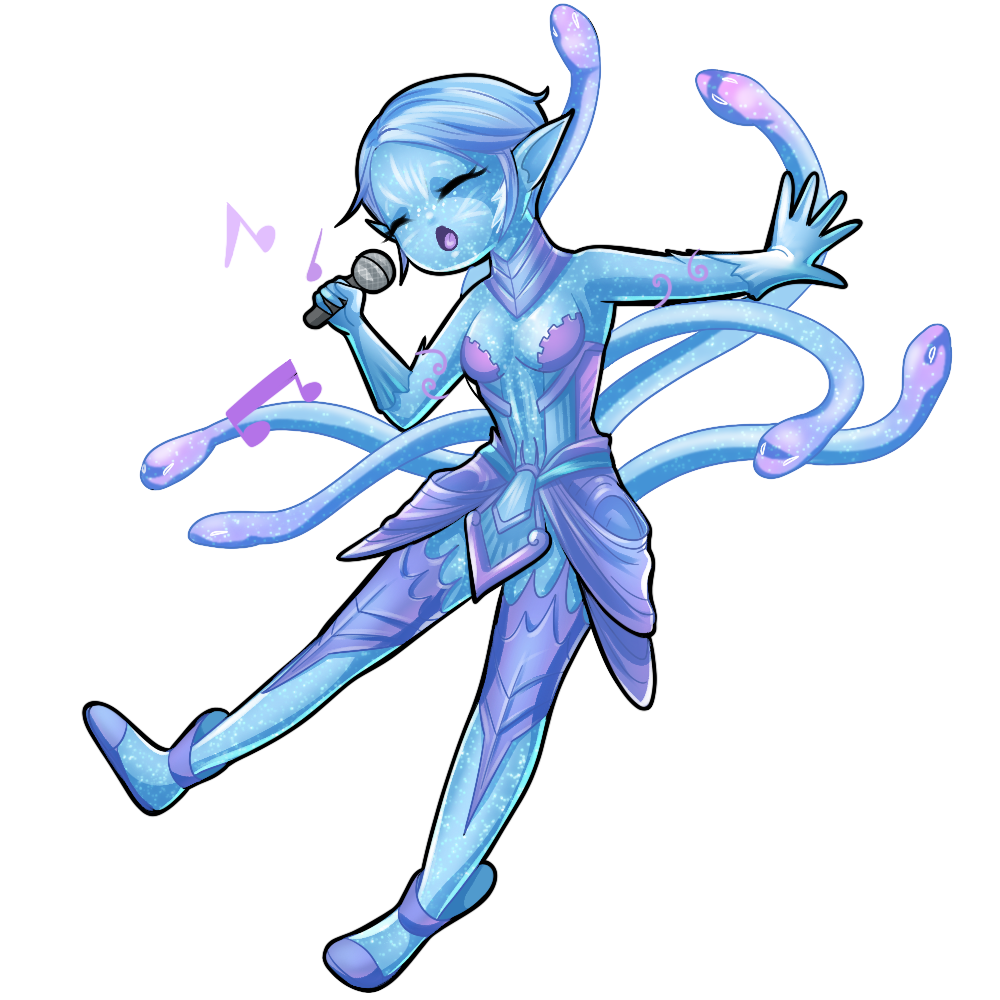 Oceanic Body - Syriend's body is deeply connected to the ocean in more than her strange blue appearance. She can summon six watery serpents from her back. Each has a different personality and seems to have a mind of its own. They are also able to take out her musical instruments for her from some unseen storage.